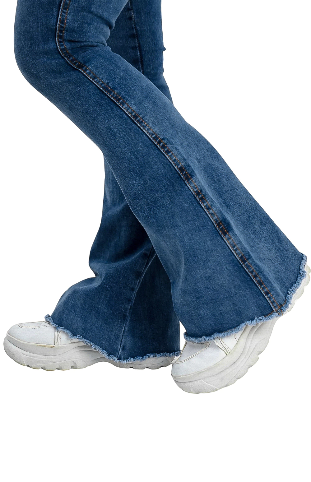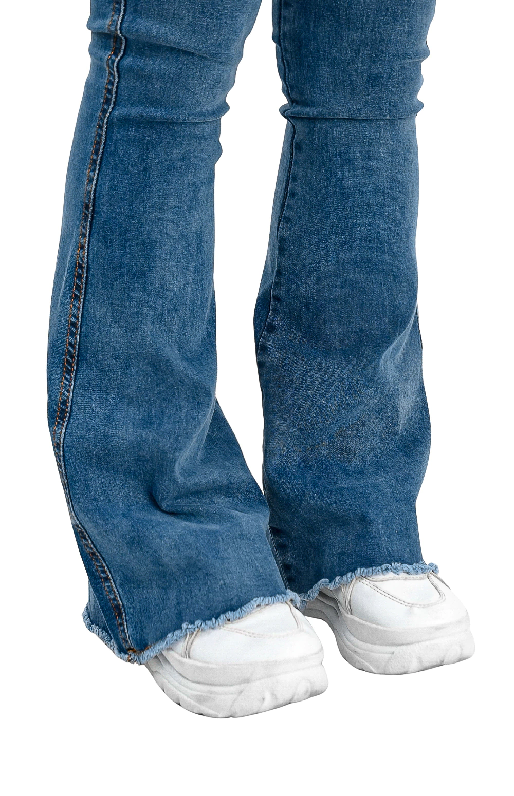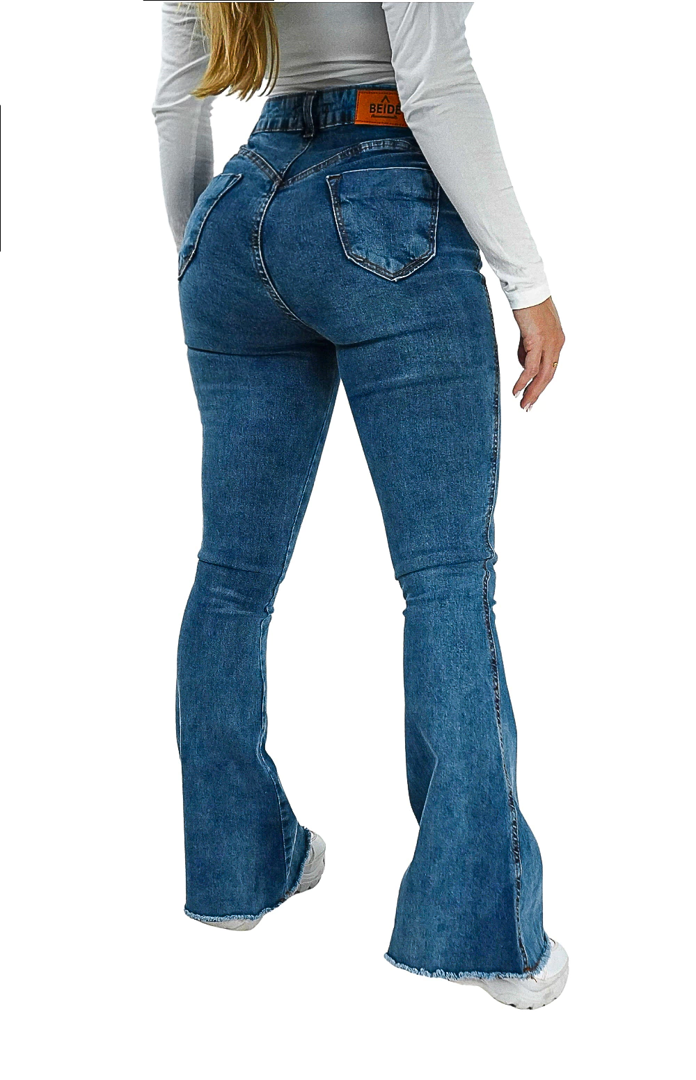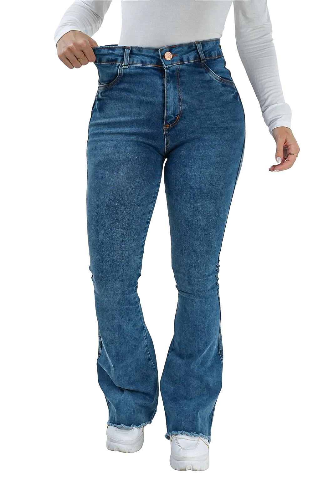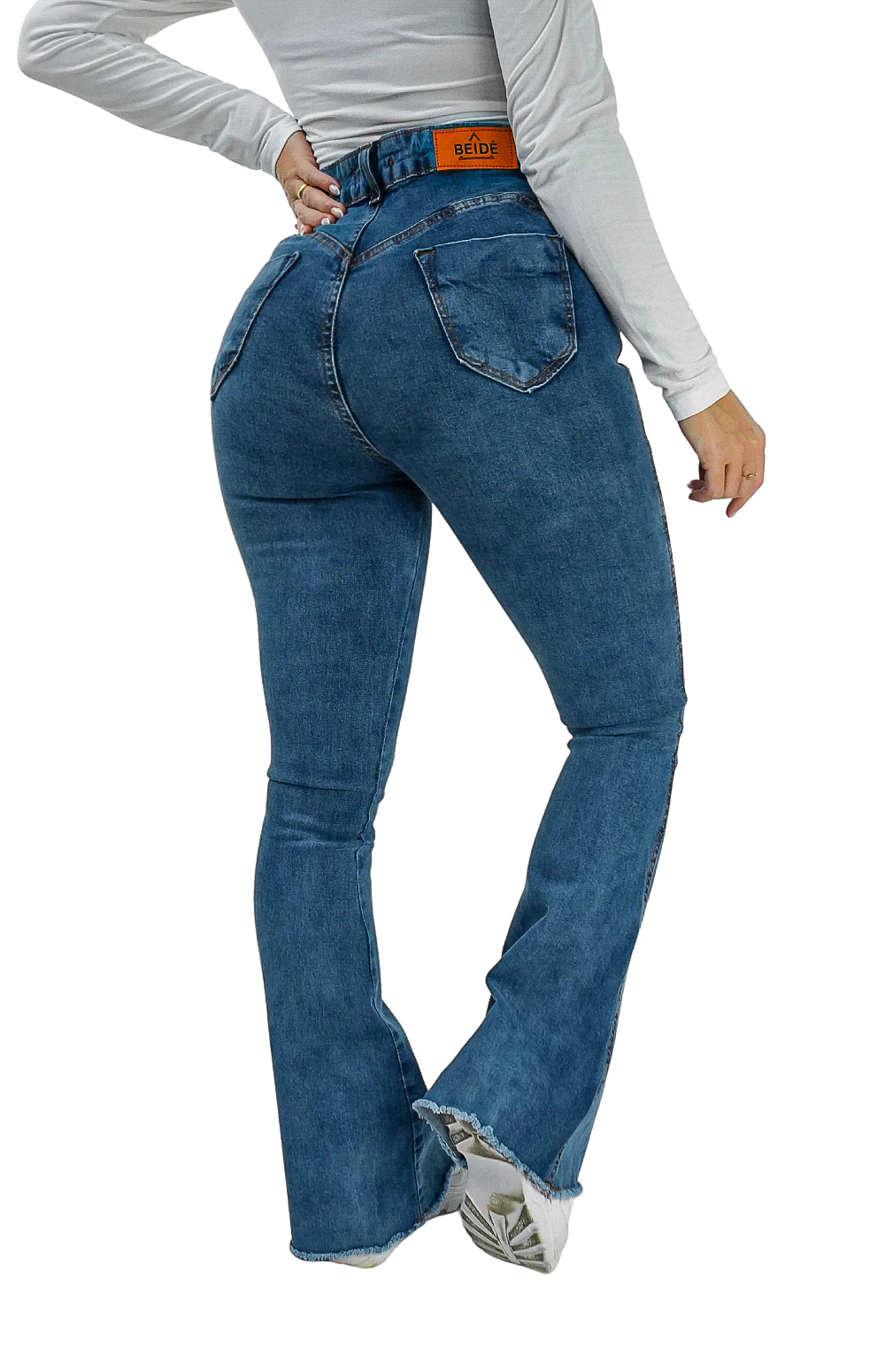 A calça jeans Flare Barra Desfiada Maldivas da BEIDÊ foi desenvolvida especialmente para mulheres com menos de 1,60m de altura. Com entrepernas de 70 cm, ela possui o comprimento ideal para usar com tênis, rasteiras ou salto — sem a necessidade de fazer barra e sem perder o efeito da modelagem flare.