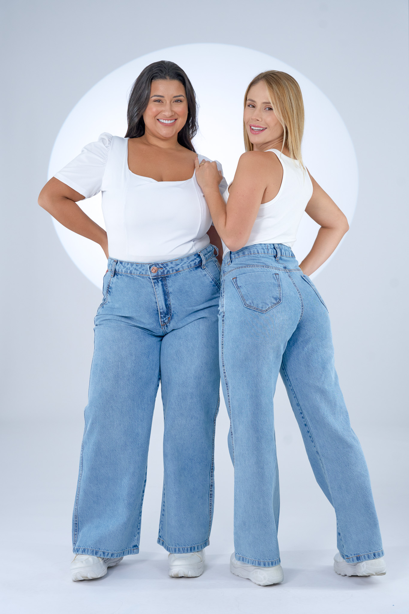 A modelagem wide leg tem caimento amplo e moderno, enquanto a cintura alta valoriza a silhueta com conforto.